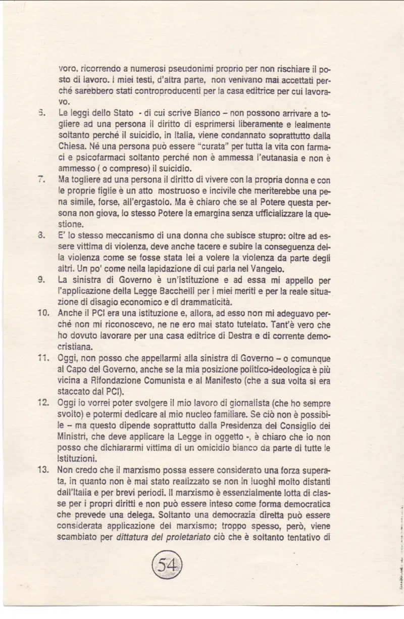 Così ha inizio l'autobiografia di Pietro Valassina, autore di un pamplet dal titolo Solo i cani hanno un cuore (supplemento al periodico Logos n. 35, nov.-dic. 1988).
